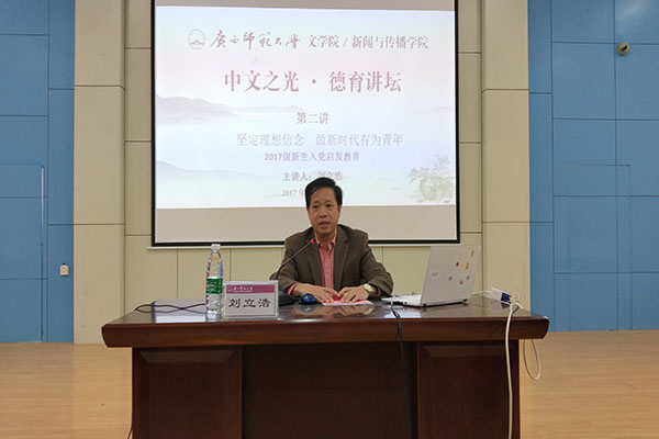 为加深大学生对中国共产党的了解,培养2017级新生爱党爱国意识和青年的责任担当。11月2日上午,学院党委书记刘立浩分为本科新生做了主题为“坚定理想信念,争做新时代有为青年”的“中文之光•德育讲坛”专题讲座。