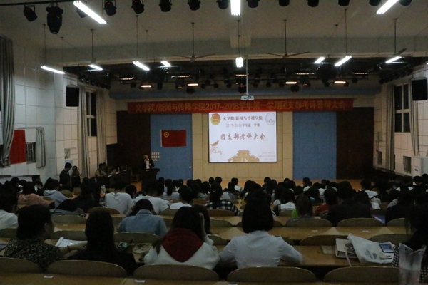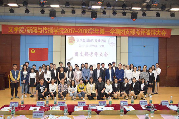 近日,文学院/新闻与传播学院在雁山校区文二区119教室举行2017年-2018学年第一学期团支部考评大会。学院党委副书记、纪委书记蓝廖国,学院团委书记李逊以及各年级辅导员,校团委学生代表,媒体代表和各兄弟学院分团委代表,团支部考评监督小组出席了本次大会。