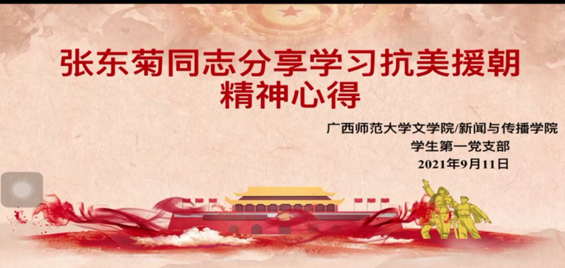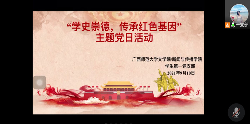 历史是最好的老师。历史在人民的探索、奋斗中造就了中国共产党,党团结带领人民群众书写了中华民族发展新篇章。为了增强心中的信仰力量,以便更好地在实践中擦亮精神底色,知行互促,9月10日上午,文学院/新闻与传播学院学生第一党支部于腾讯会议举办了主题为“学史崇德,传承红色基因”的党日活动。本次学习活动由支委覃莫艳主持,支部全体党员积极参与了本次活动。
