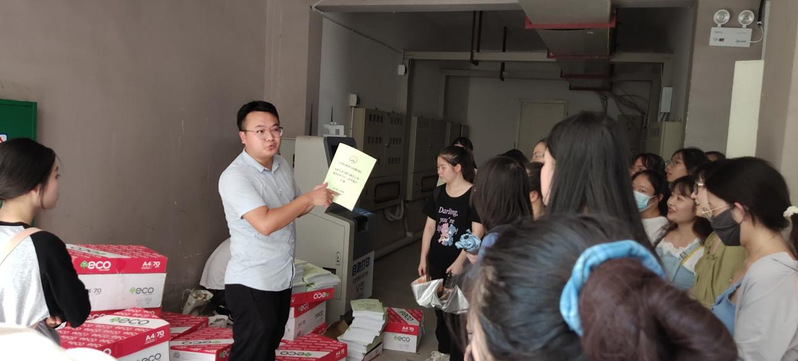 队伍一共分为四组,在新生代理班主任的配合下,将所有书籍都依次分发到各个新生的桌面上。虽然烈日炎炎,气温一度高达37度,我们的党员同志和积极分子仍然顶着高温从一楼爬到六楼将各类书籍分发到位。最后将残余的垃圾打扫干净,并放进垃圾桶里。