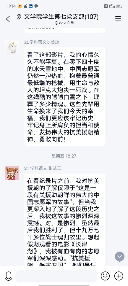 最后,陈浩杰同志在支部其他同志交流学习后总结到2021年是抗美援朝战役胜利60周年,重温这段纪录片不仅是对英烈的崇尚,也是对英灵的致敬,更是对抗美援朝这一“立国之战“的不忘。历史的道路不全是坦平的,和平来之不易,走到艰难险阻的境界,全靠雄健的精神才能够冲过去。所以我们今天的纪念,是为了更好地传承,是为了不忘英烈们的追求与遗志,不忘他们为国家和人民做出的伟大牺牲,不忘他们用热血与赤诚铸就的崇高精神。今天,我们正前所未有地接近实现中华民族伟大复兴的目标,前所未有地具有实现这个目标的信心和能力。传承英烈精神,汲取奋进力量,书写新的恢宏英雄史诗,正是时代赋予我们这一代人的伟大使命。所以每一位党员要以高度政治自觉学习党史,不断筑牢信仰之基、补足精神之钙、把稳思想之舵,秉持“江山就是人民、人民就是江山”的初心理念,不断追求“我将无我,不负人民”的精神境界,切实做到学史明理、学史增信、学史崇德、学史力行,持之以恒发扬党的光荣传统和优良作风。