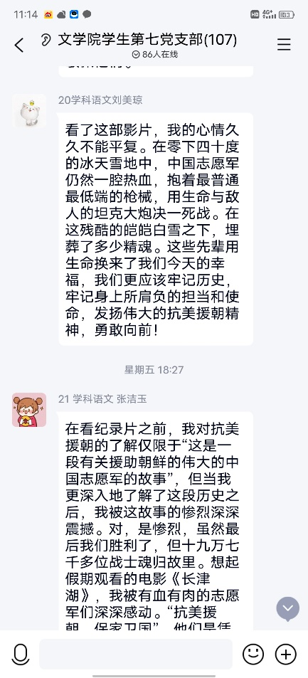 2021年10月9日,学生第七党支部在线上观看了纪录片《冰血长津湖》并以抗美援朝英雄事迹为主题的党日活动。活动由陈浩杰同志主持,一共进行了两项议程。首先是学习了纪录片《冰血长津湖》,第二是在会同志分享学习心得。