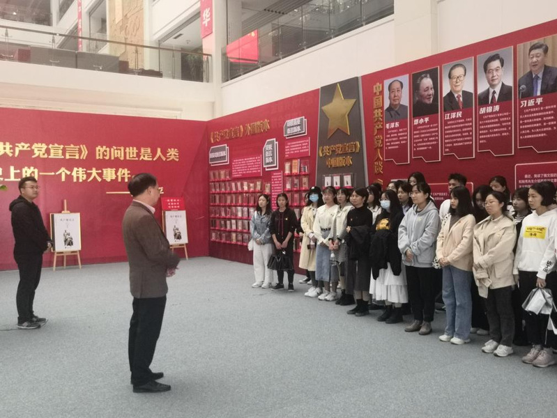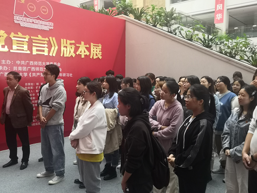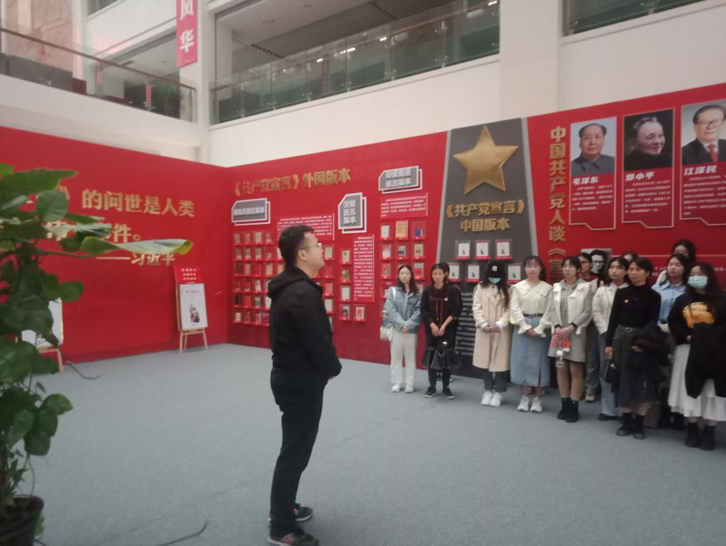 首先,讲解员带领着党员同志从《共产党宣言》问世开始讲解。《共产党宣言》问世标志着马克思主义的诞生。讲解员向党员同志们介绍了《共产党宣言》的外国版本。其中主要包括德语版本、英语版本等版本。每一个版本都拥有着各式各样的出版样式。讲解员重点讲解了中国版本,并介绍了中国共产党人谈《共产党宣言》的一些内容。除此之外,讲解员还向党员同志们介绍了广西师范大学与《共产党宣言》的故事。党员同志们学习到了很多关于《共产党宣言》的知识。