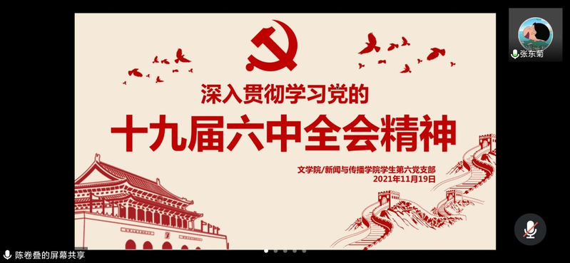 2021年11月19日下午,文学院/新闻与传播学院学生第六党支部组织全体党员学习党的十九届六中全会精神,全面贯彻落实了十九届六中全会精神,深入学习中国共产党百年历史,提高支部成员的历史使命感和坚定初心信念。本次会议以线上腾讯会议的形式展开,支部委员陈卷叠同志主持会议。