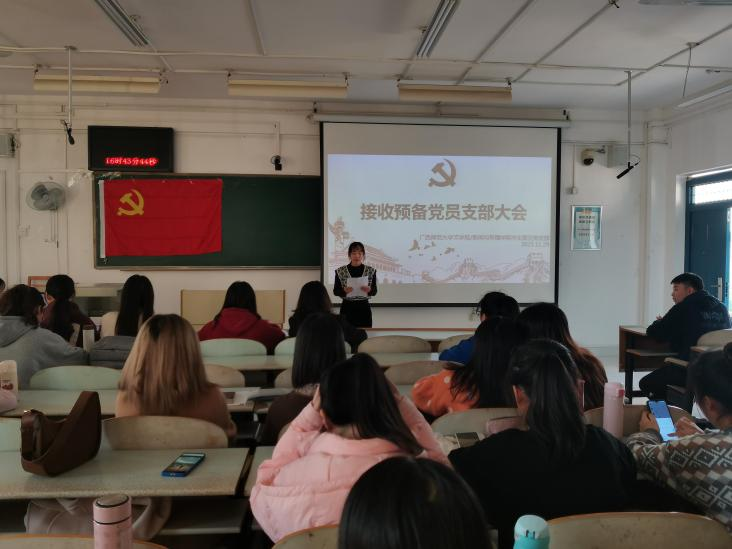 2021年11月29日下午,学生第五党支部在文科楼一区413教室召开接收预备党员大会,大会由支部副书记秦雅婕主持,支部书记廖慧芝、学生第五党支部7位正式党员、14位预备党员及本次的17位发展对象参加了此次会议。