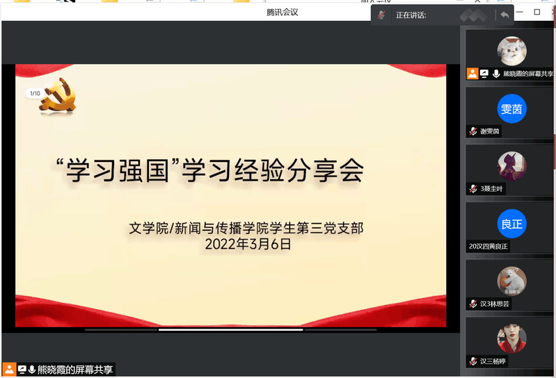 学生第三党支部于2022年3月6日利用腾讯会议举行了以“‘学习强国’学习经验分享会”为主题的线上主题活动,支部全体党员、入党积极分子参加会议。本次党日活动由三部分组成,分别是假期“学习强国”学习情况汇报、同志分享学习经验、支部书记总结发言。活动由组织委员熊晓霞同志主持。