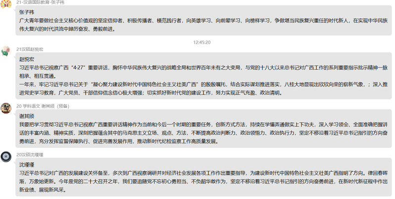 张子祎同志在线上分享了《习近平考察中国人民大学,重点强调了什么?》一文供全体党员进行更深刻的学习。活动最后,张子祎同志总结,我们要深入学习贯彻习近平总书记“4·27”重要讲话精神,践行习近平总书记视察广西“4·27”重要讲话精神和对广西工作系列重要指示要求,深刻领悟“两个确立”的决定性意义,坚决做到“两个维护”,以实际行动迎接党的二十大胜利召开。作为青年党员,我们要做社会主义核心价值观的坚定信仰者、积极传播者、模范践行者,向英雄学习、向前辈学习、向榜样学习,争做堪当民族复兴重任的时代新人,在实现中华民族伟大复兴的时代洪流中踔厉奋发、勇毅前进。