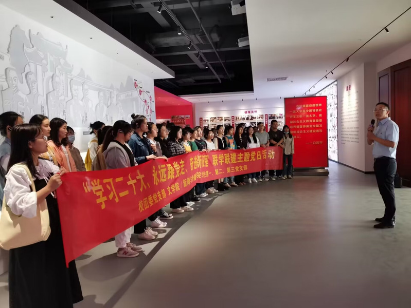 10月28日,文学院/新闻与传播学院学生第一、第二和第三党支部联合广西师范大学校团委党支部开展“学习二十大、永远跟党走、奋进新征程”联学联建主题党日活动。文学院/新闻与传播学院党委副书记韦敏及校团委书记张亮亮、副书记甘迎出席活动,学生第一、第二、第三党支部党员参加活动,一同前往雁山校区图书馆参观广西师范大学校史馆。通过学生校史宣讲团讲解师大人、师大事,引导师生感悟践行党的二十大精神、努力成为堪当民族复兴重任的时代新人。