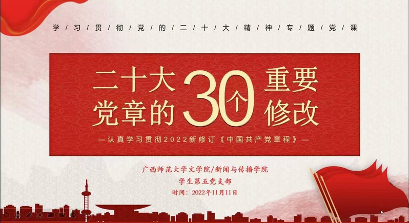 习近平总书记指出:“党章是我们立党、治党、管党的总章程,是全党最基本、最重要、最全面的行为规范。”党的全国代表大会根据党的理论创新和实践发展的需要对党章进行修改,确保党章与时代同行并进,是我们党的一个惯例,也是我们党的一个优势。党的二十大审议通过的《中国共产党章程(修正案)》,凝聚了全党的共同意志,切实巩固了党的二十大的重大政治成果,为全面建设社会主义现代化国家、全面推进中华民族伟大复兴统一了思想、意志和行动。为深入贯彻学习党章修改内容及现实价值,广西师范大学文学院/新闻与传播学院学生第五支部全体党员于2022年11月11日,在腾讯会议进行了党员活动日专题学习。