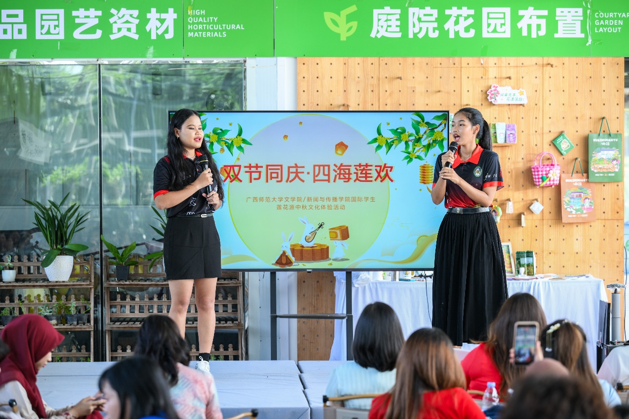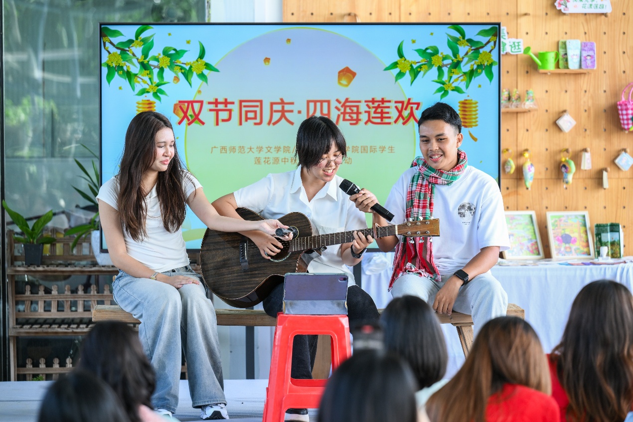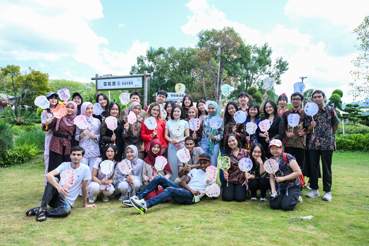 活动伊始,国际生们在莲花源生态田园景区内聆听了关于本地华侨历史的简短介绍,随后体验非遗手工艺品制作。国际生们在师傅的悉心指导下,完成了做手工月饼活动和非遗漂流漆扇制作。午后,中外学子们轮番登场,献上了精彩纷呈的才艺表演。活动最后,师生们在景区绚烂的花海之中,在桂林特有的喀斯特地貌背景下,合影留念。