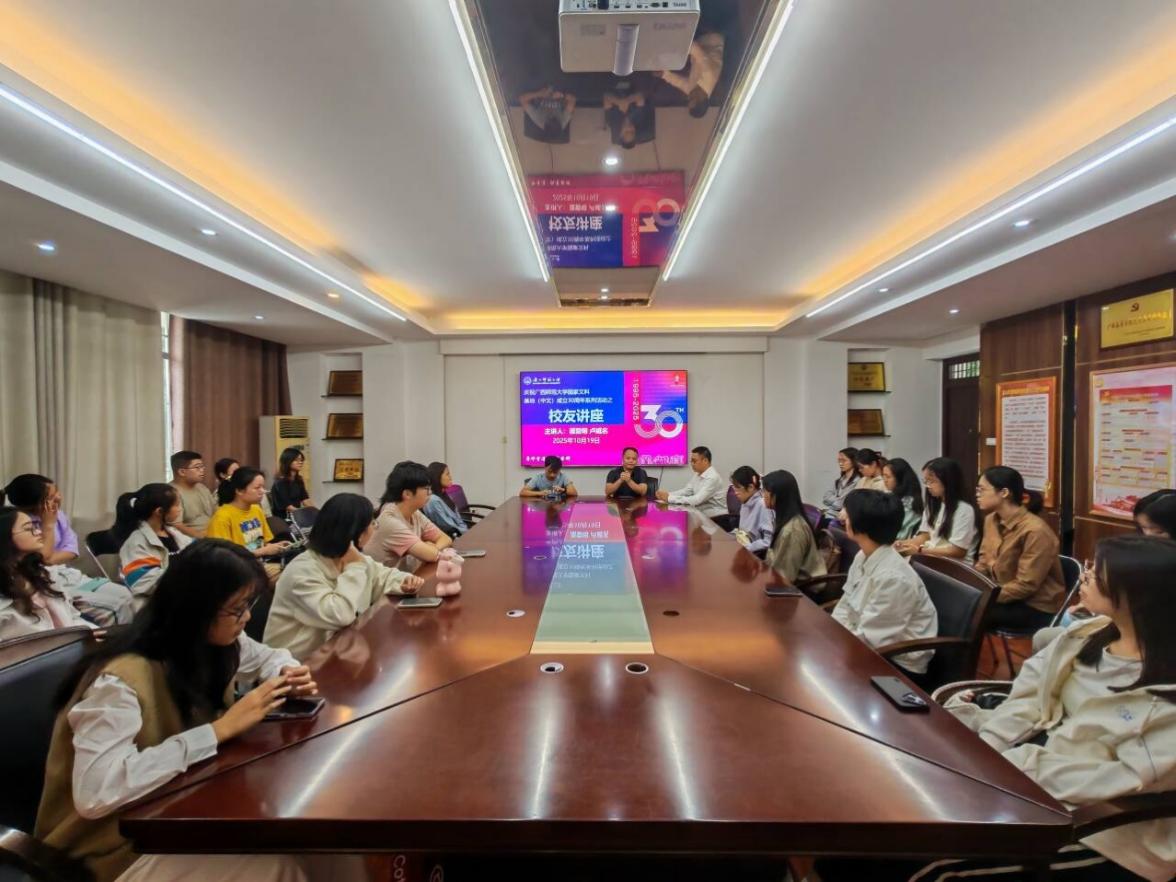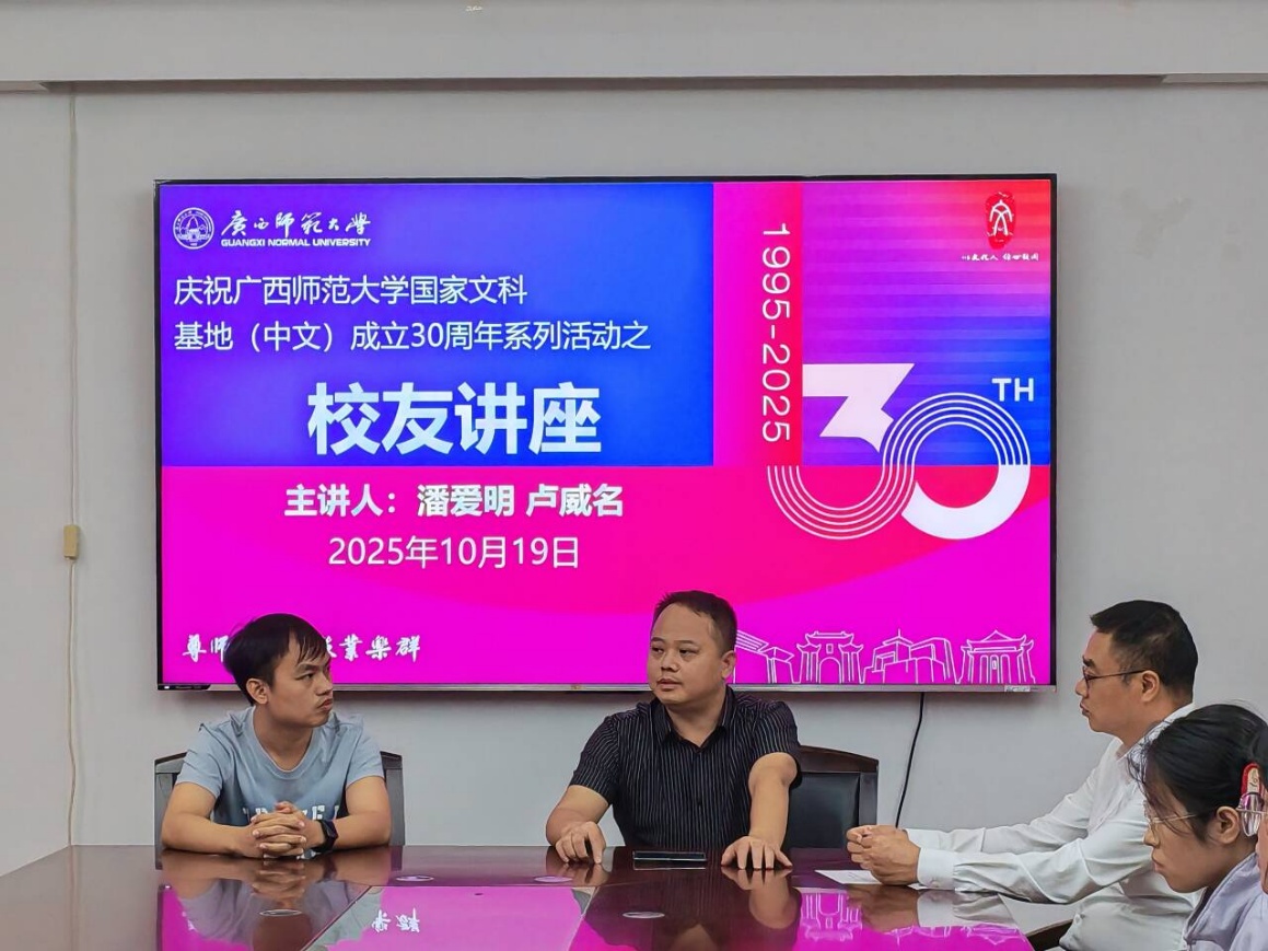 2025年10月19日,广西师范大学国家文科基地(中文)成立30周年系列活动之校友讲座在行政楼南楼101室顺利举行。本次活动特邀佛山市南海区石小实验学校副校长潘爱明、佛山市南海区石英实验学校教师卢威名,两位优秀校友返校,为文学院大三学生们开展了专题讲座。广西师范大学文学院/新闻与传播学院党委相关负责人主持交流活动,现场气氛热烈。