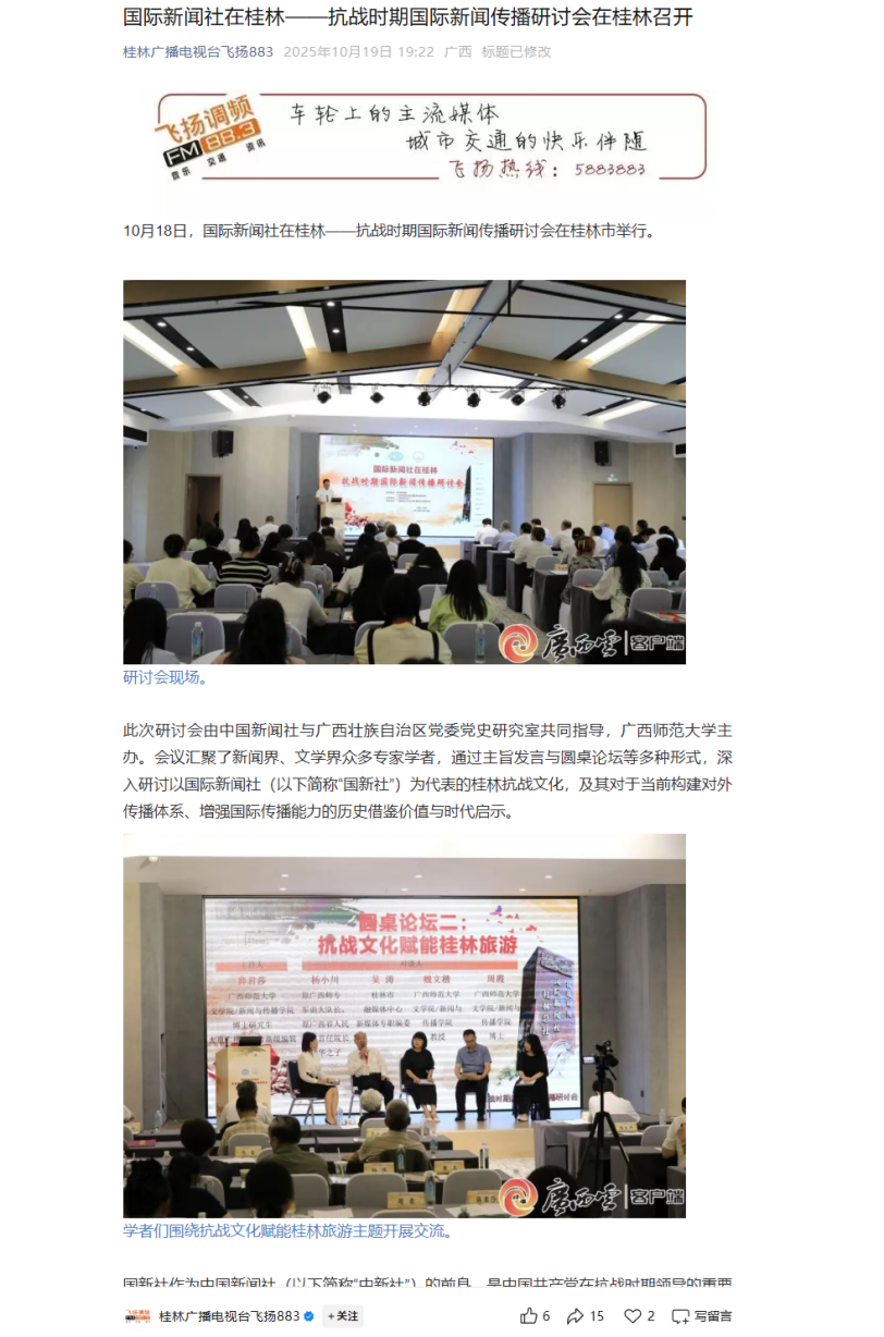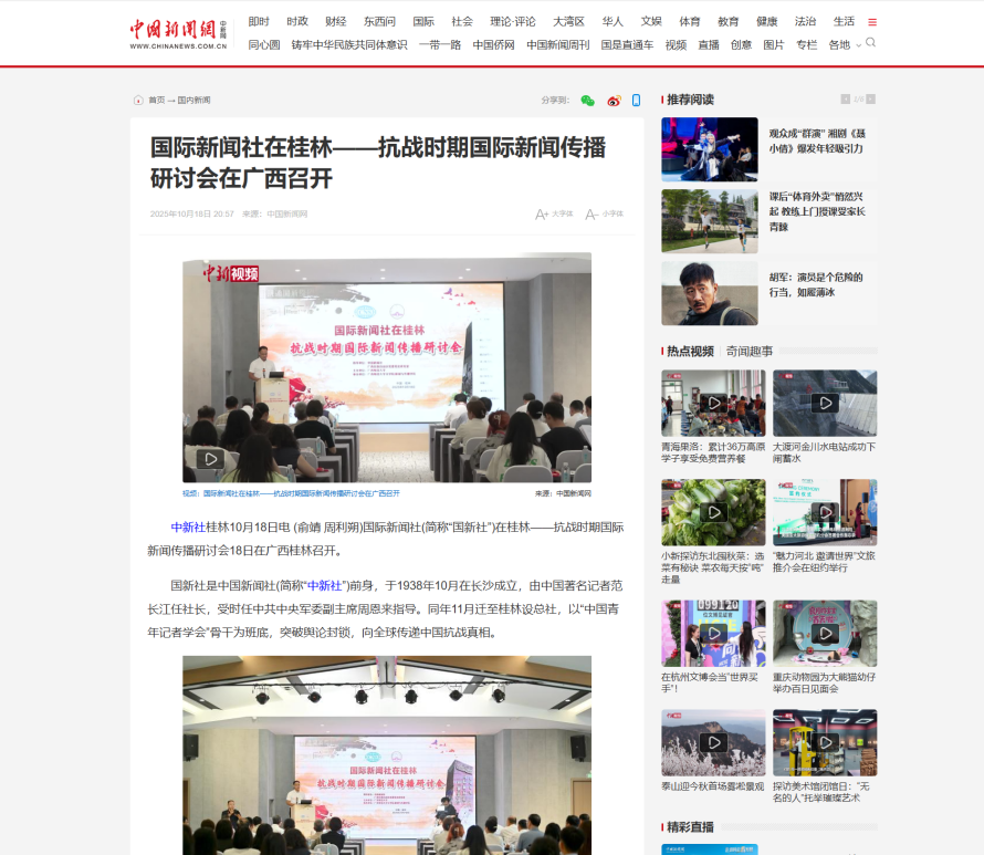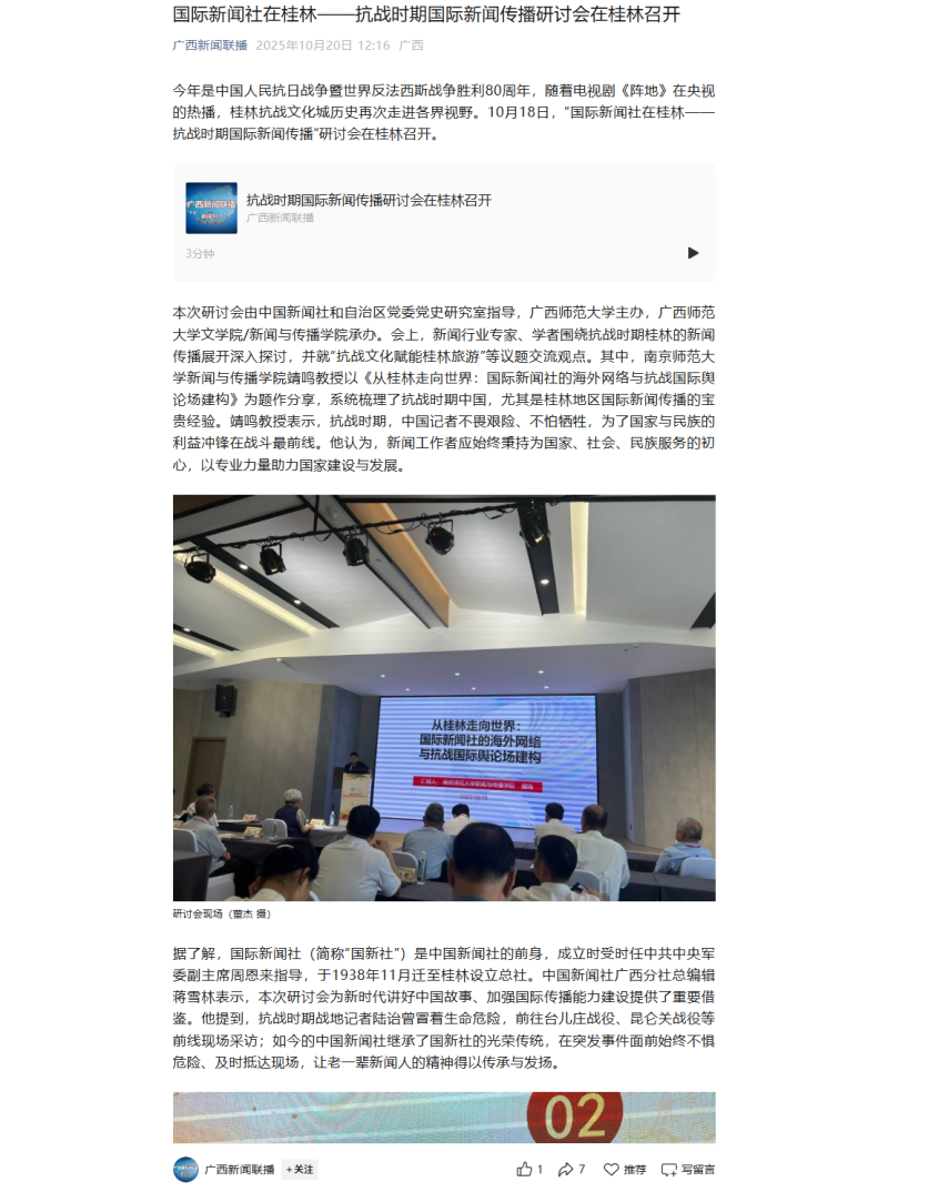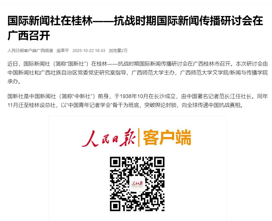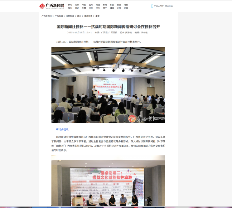近日,【人民日报】【中国新闻网】【中国新闻社】【广西新闻网】【广西新闻联播】【桂林广播电视台】报道我校举办国际新闻社在桂林——抗战时期国际新闻传播研讨会。