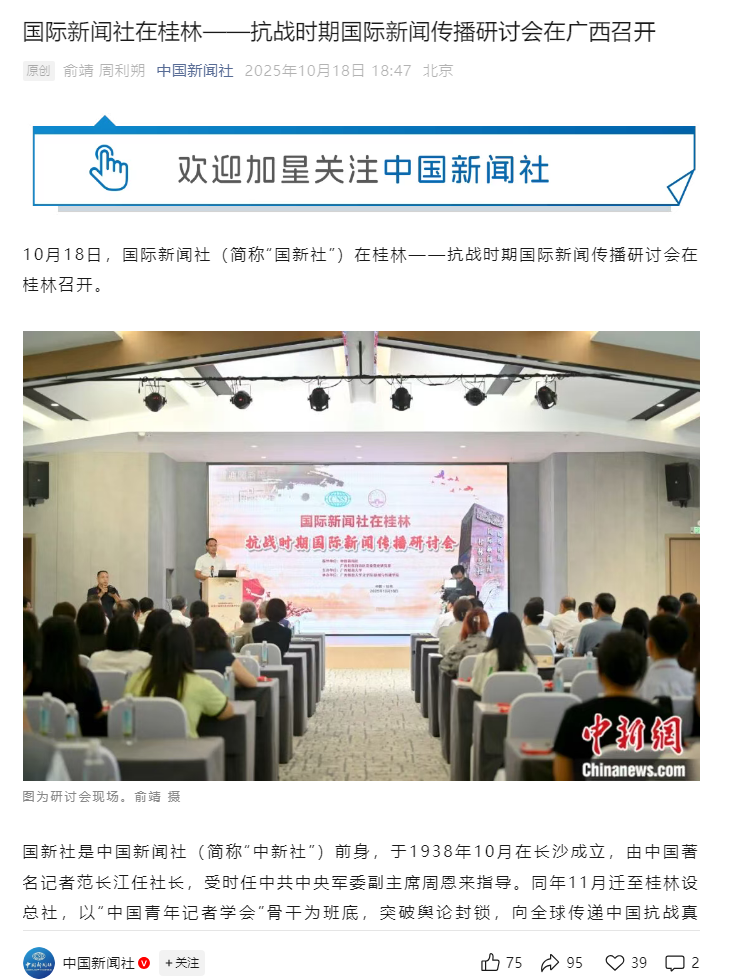 近日,国际新闻社(简称“国新社”)在桂林——抗战时期国际新闻传播研讨会在广西桂林市召开。本次研讨会由中国新闻社和广西壮族自治区党委党史研究室指导,广西师范大学主办,广西师范大学文学院/新闻与传播学院承办。