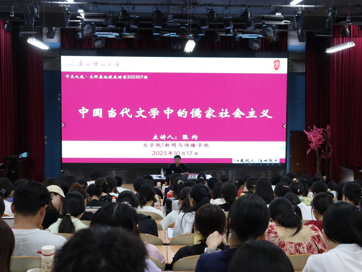 2025年10月17日,广西师范大学文学院/新闻与传播学院202507期“中文之光•文科基地拔尖讲堂”在我校雁山校区文二区119学术报告厅成功举办。本次讲座特邀中山大学中国语言文学系张均教授主讲,主题为“当代文艺中的儒家社会主义——以《大山的女儿》为例”。讲座由刘铁群教授主持,汉语言文学专业两百余名学生积极参与。