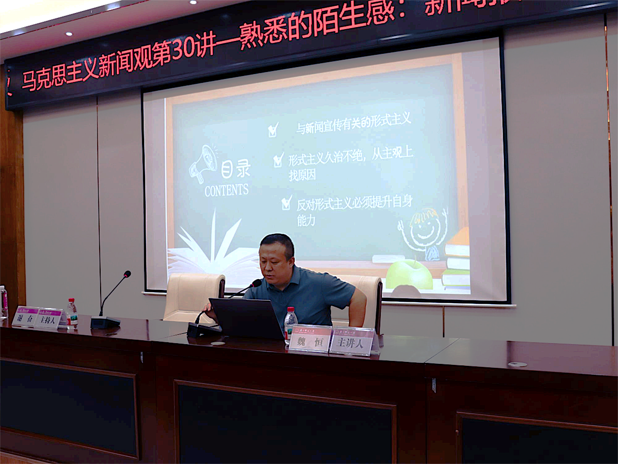 洗头加班”等典型案例,介绍了新闻报道形式主义的五类表现,让同学们直观了解了形式主义的危害。针对形式主义久治不愈的根源,魏恒认为思想滑坡、作风漂浮等主观因素是核心症结。他指出,反对形式主义需着力提升专业能力:一要明晰必要形式与形式主义的界限;二要熟练掌握新闻文体写作方法,始终坚守“尊重事实、遵守规矩、遵循规律”的职业底线;同时,具备“想题”“想事”“想词”的综合能力。