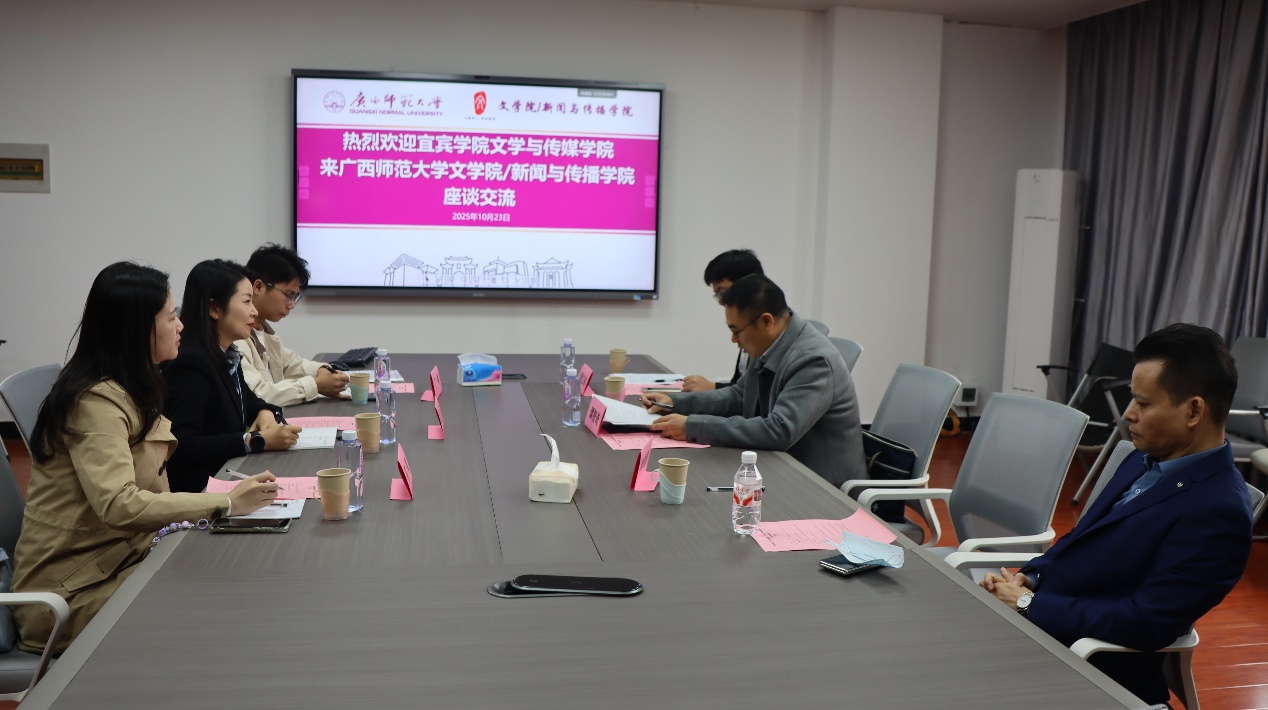 周剑清就学科建设情况,与对方进行了深入的交流。张易对广西师范大学文学院/新闻与传播学院的热情接待表示感谢,并介绍了此次调研交流的目的。他系统阐述了宜宾学院在办学特色和育人成果等方面的突出优势,也介绍了文学与新闻传媒在办学特色和学科建设上的特色。他表示,希望以此次交流为契机,在广西师范大学文学院/新闻与传播学院的有力支持下,双方能够持续深化在学科建设、人才培养和科学研究等领域的务实合作。