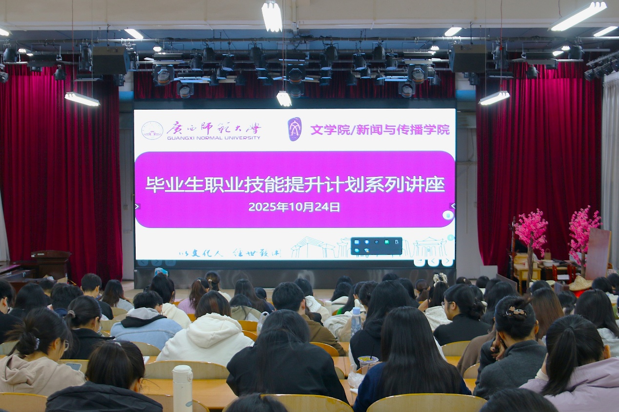 10月24日,文学院/新闻与传播学院在雁山校区文二区119学术报告厅举办毕业生职业技能提升计划系列讲座第三讲。讲座邀请学院副院长周剑清主讲,200余名毕业生参加活动。