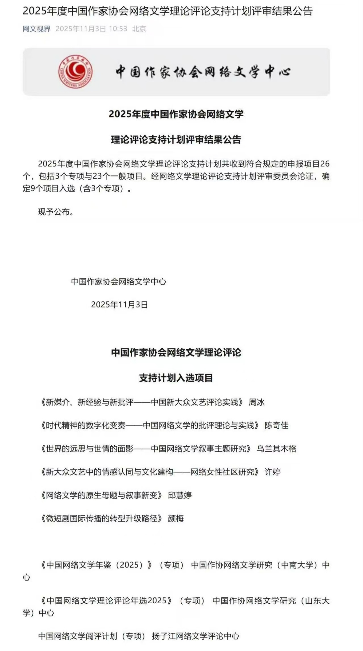 11月3日,2025年度中国作家协会网络文学理论评论支持计划评审结果公布。其中,我院邱慧婷副教授的项目《网络文学的原生母题与叙事新变》成功入选。