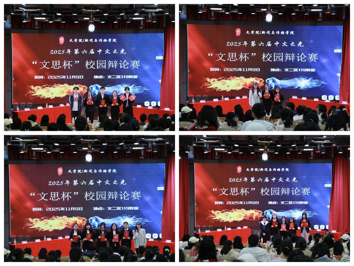 本次决赛分为季军赛与冠亚军赛两场,辩题紧扣文化底蕴与人生价值,展现深厚思辨内涵。经过激烈辩论与评委团公正评审,“圣火喵喵教队”摘得桂冠,“深藏blue队”荣获亚军,“语筑青云队”获季军,龚路瑶、游珊获评“本场最佳辩手”。评委为获奖选手颁奖并合影,辩论赛在热烈的氛围中圆满落幕。