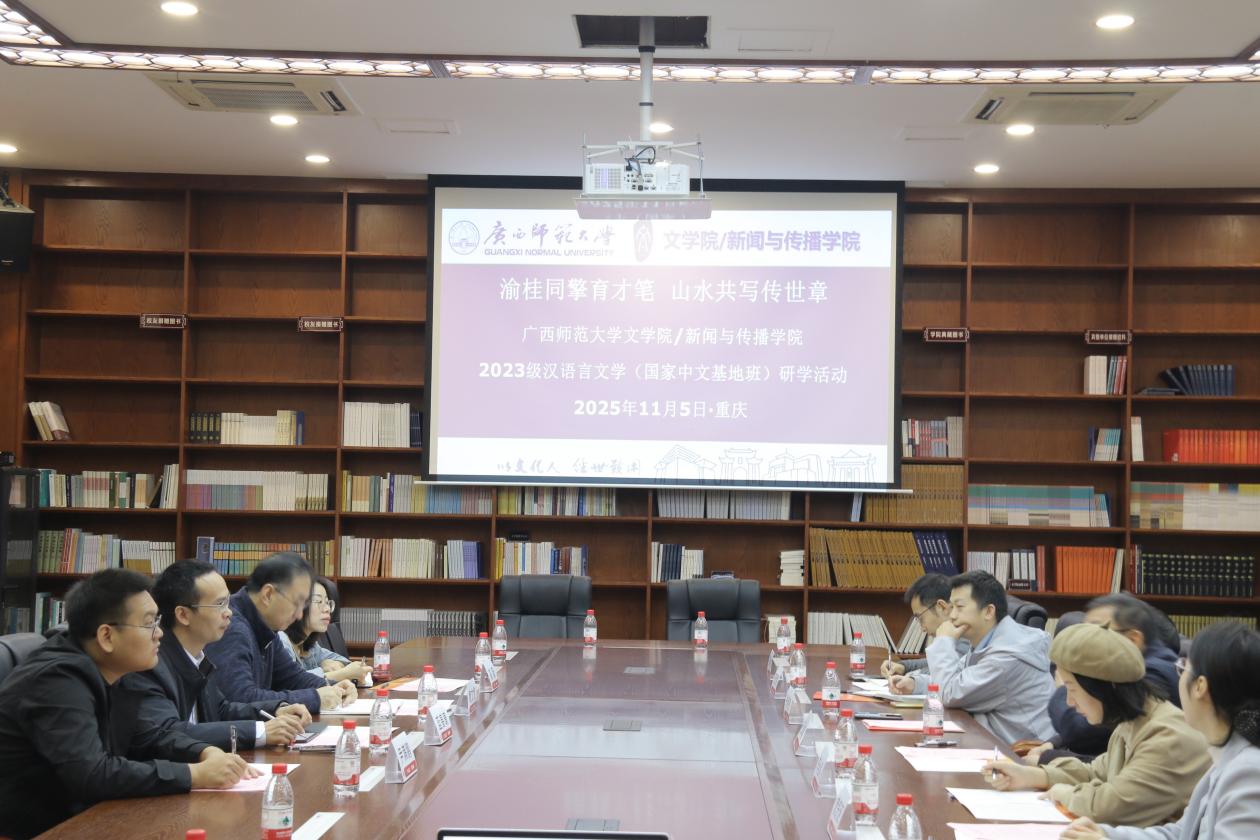 为深化中国语言文学拔尖学生培养基地建设,探索拔尖创新人才培养提质路径,在广西师范大学国家文科基地成立30周年之际,2025年11月5日,广西师范大学文学院/新闻与传播学院与西南大学文学院交流座谈暨基地班研学见面会在西南大学举行。双方围绕拔尖学生培养基地建设、文学教育、人工智能时代的中文写作教学、校际资源共建共享等议题深入研讨,凝聚起文科教育高质量发展共识。