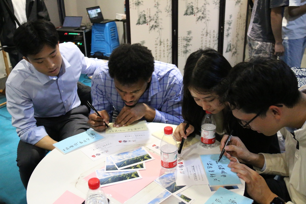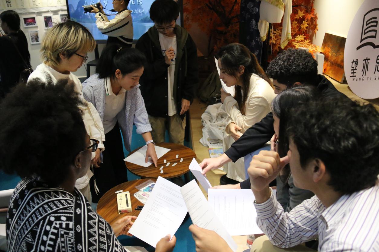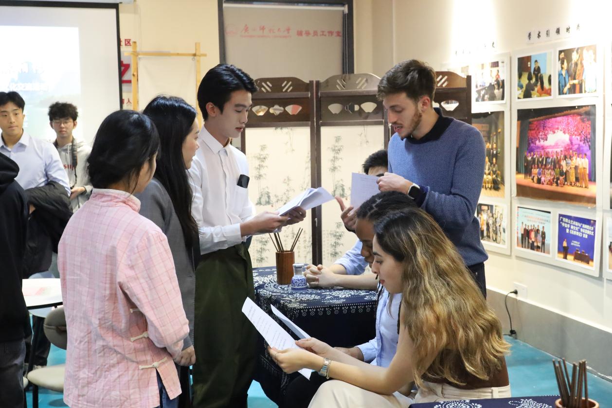 在互动环节,中外学生共同学唱《花桥荣记》主题曲《老家》,在旋律中感受乡愁的情感共鸣。随后开展的“社团文化工作坊”将气氛推向高潮。学生分组参与了由望道社团组织的“笔墨诗心”诗句书写、“山水映象”干花书签制作,以及 “戏韵瞬间”角色体验活动。他们或提笔临摹“江作青罗带,山如碧玉簪”等经典诗句,或用干花拼贴心中的桂林山水,或尝试演绎话剧片段中的台词对白,在动手实践与角色代入中深切感受中华优秀传统文化的魅力。