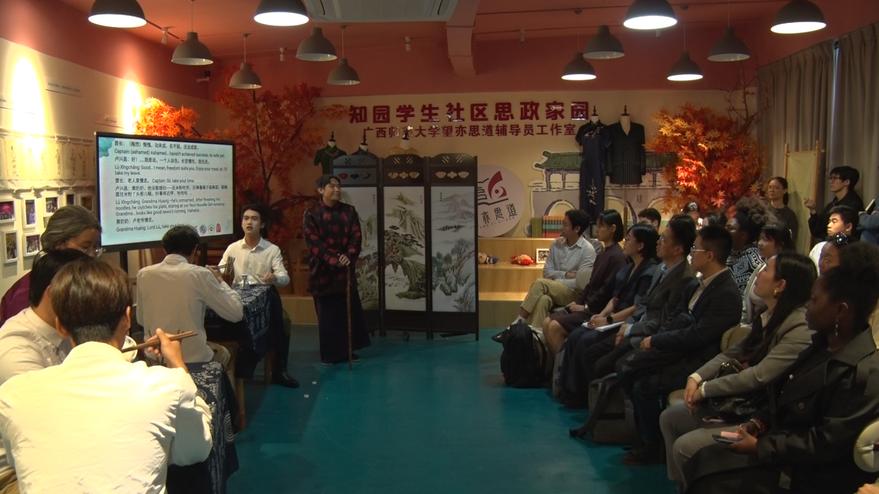 随后,交流活动移至“望亦思道”辅导员工作室进行。望道社团指导老师盘丹主持本次活动。工作室负责人、社团指导老师李逊介绍了望道话剧社、记录社、读写社三大社团的创立理念与发展成果,展示了学院学生社团在文化育人方面的积极探索。望道社团指导教师杨楠就话剧《花桥荣记》的创作背景与文化内涵作深入解读。紧接着,话剧社成员现场演绎了《花桥荣记》第四场与第六场精彩片段,真挚的表演赢得阵阵掌声。