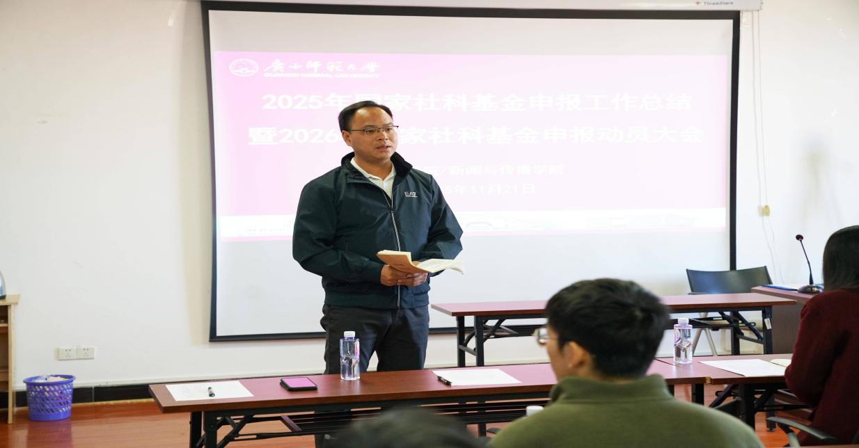 刘世文副院长分析总结了2025年学院国家社科基金申报工作,梳理2025年申报工作中存在的问题与不足,并针对性地提出推进和改善申报工作的具体措施。会上梳理了2026年学院可申报国家社科基金教师基本情况,具体布置了2026年学院国家社科基金申报工作,动员和鼓励大家应报尽报,做大申报基数,学院会一如既往地做好国家社科项目申报的组织和服务工作,助力老师们提高论证质量和申报书撰写质量。
