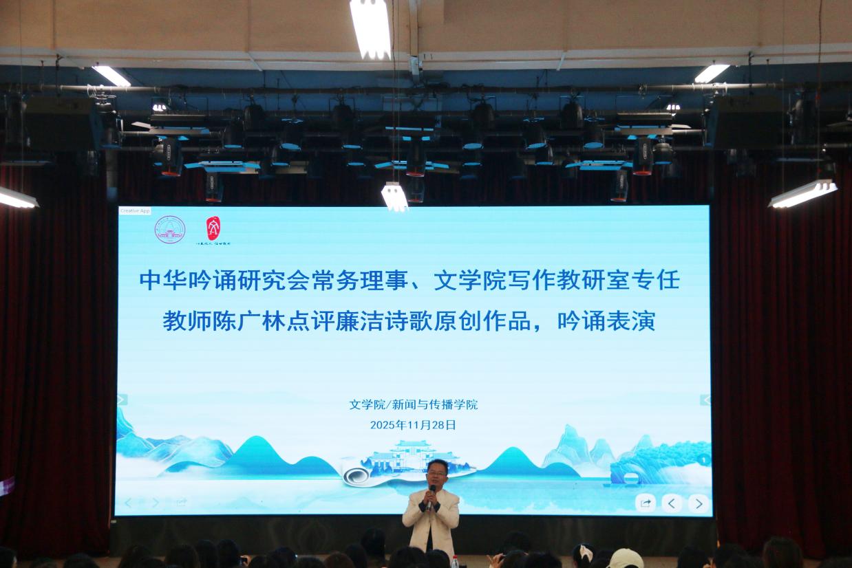 会上,曹婉婷分享“清廉文院”建设阶段性成果,号召师生以笔为犁、以身为媒,共筑风清气正的学院生态。各党支部代表进行诗词鉴赏,四名学生代表登台朗诵原创廉洁诗词,分享创作感悟与心得。