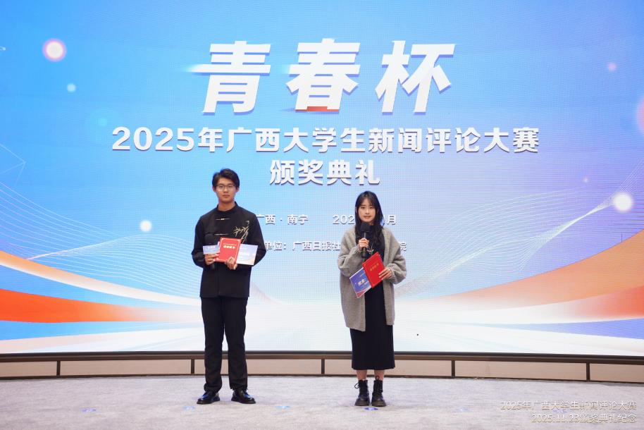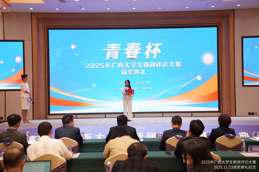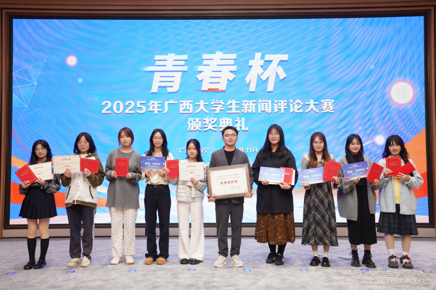 11月23日下午,2025年“青春杯”广西大学生新闻评论大赛颁奖典礼在南宁举行。我院学子凭借出色表现在此次大赛中脱颖而出,共有16名同学的13件优秀作品获奖,获奖数量位列全区高校前列。其中文字长评论、融媒体评论双赛道开花,均斩获一等奖,融媒体赛道获奖7项创历史新高,充分展现了我院学子的专业素养与青春风采。同时,学院荣获“优秀组织奖”。学院新闻学教研室副主任谢奋老师带队前往颁奖典礼现场,与获奖学子共同见证荣耀时刻。