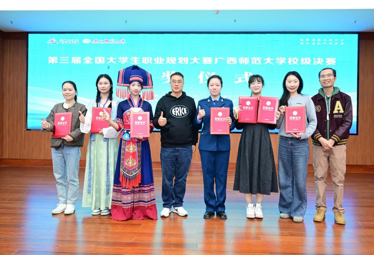 2025年11月30日,第三届全国大学生职业规划大赛广西师范大学校赛决赛于育才校区举行。经过激烈角逐,我院学子凭借扎实的专业基础和出色的现场表现,最终斩获"四金一铜"的优异成绩。其中,2024级汉语言文学专业本科生张卓禧、2024级汉语国际教育专业本科生李涓雅荣获成长赛道金奖;2023级汉语言文学专业本科生奚晓媛、2022级汉语言文学专业本科生胡润元荣获就业赛道金奖;2024级世界文学与比较文学专业研究生陈怡博获就业赛道铜奖。