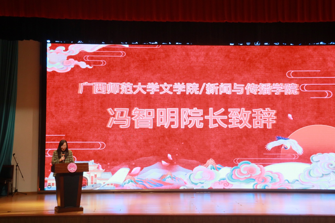 文学院/新闻与传播学院院长冯智明在晚会开始前致辞,她希望全体同学以艺为媒、以情为桥,在交流中互学互鉴,在展演中增进理解,携手搭建中外文明交流的坚实纽带,为推动跨文化交流与国际友谊发展贡献青春力量。