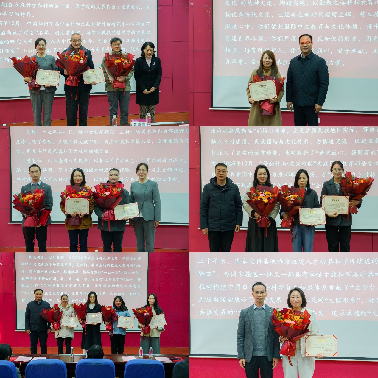在“中文之光·年度致敬”颁奖活动环节,学院对2025年度涌现出的优秀团队和个人进行了集中表彰。