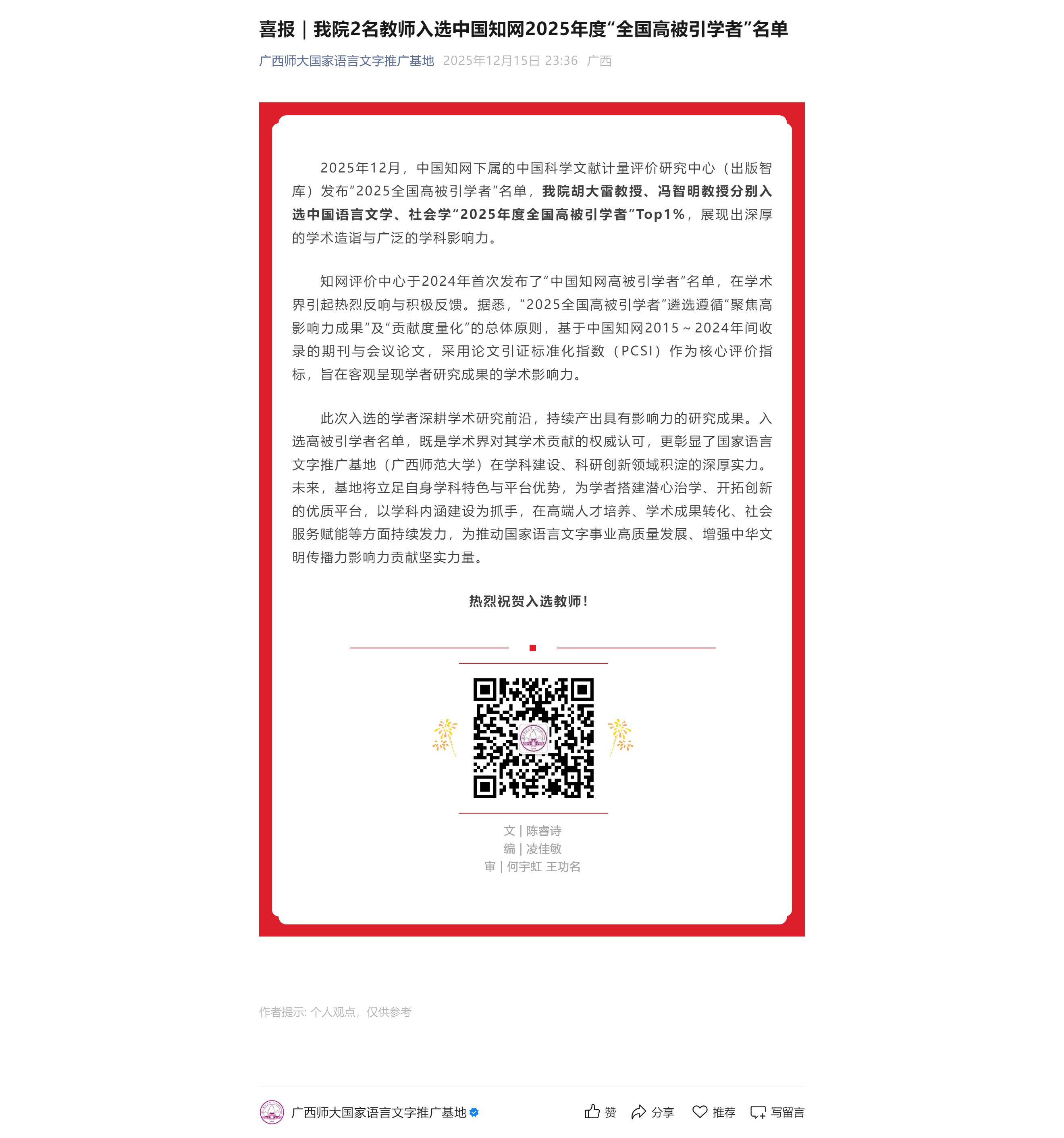 我院2名教师入选中国知网2025年度“全国高被引学者”名单