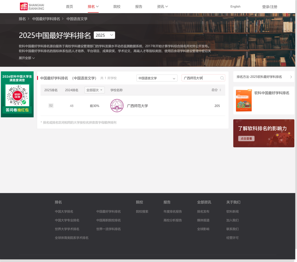 学院紧抓学科建设这一“生命线”,通过高水平布局推动高质量发展。顺利完成第二轮广西一流学科“中国语言文学”终期评估工作,以及“高原学科”(中国语言文学)和“潜力学科”(国际中文教育)的年度绩效评估。在2025年10月15日高等教育评价专业机构软科正式发布的“2025软科中国最好学科排名”中,中国语言文学学科保持教育部第五轮学科水平评估排名前30%,软科学专业排名中,汉语言文学进入A等,广西同类学科排名第一。
