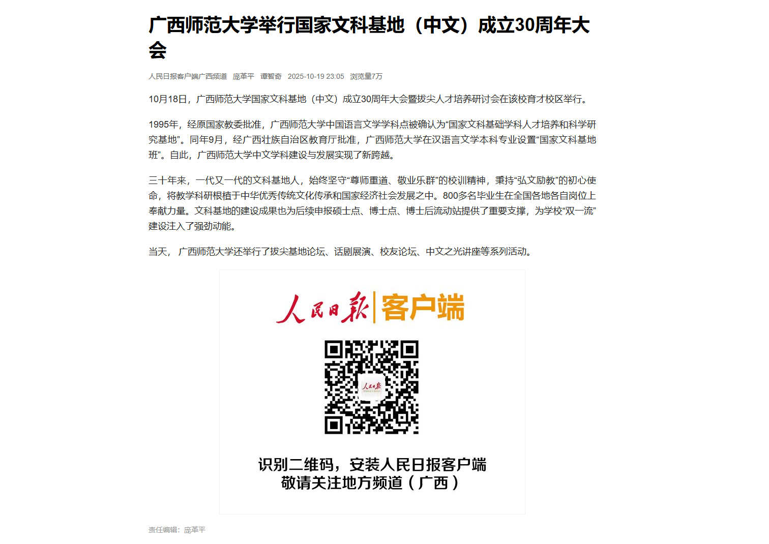 人民日报:广西师范大学国家文科基地(中文)成立30周年大会