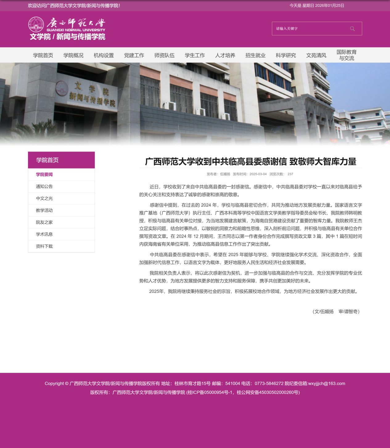 学院通过有组织科研,学院师生齐发力,科研成果实现持续提升。2025年,学院科研工作喜获丰收,7个项目获批国家社科立项,立项数全校并列第一;发表学术论文105篇,其中CSSCI期刊论文31篇(含A2级论文6篇),SSCI论文2篇,北大核心论文12篇;出版学术著作10部。获广西第十八次社会科学优秀成果奖9项、广西文艺评论优秀成果奖3项;多位教授在《光明日报》《中国社会科学报》等权威平台发表高水平学术成果,学科影响力得到显著加强;召开抗战时期国际新闻传播研讨会等高端学术会议6次,持续强化学术引领,扩大学科影响力。
