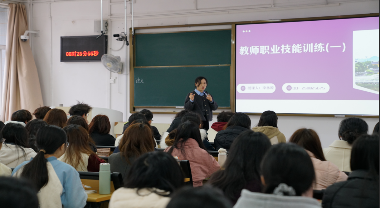 本次开学第一课听课活动聚焦李林原博士主讲的《教师职业技能训练(一)》课程。课堂伊始,李林原博士便立足语文教学实际设计课堂环节,以“你有多少种方法问出老师的年龄”趣味提问生动导入,巧妙检测学生语言运用能力,直观诠释语文工具性与人文性相统一的课程性质,迅速调动课堂氛围。授课过程中,李林原博士结合自身教学研究积累,紧扣语文教学本质与核心素养培育要求,以言语教学为核心,围绕语文课程性质、语言运用技巧、文本解读方法等关键内容展开讲解,还融入夏目漱石经典表达、秦观词句及《夜雨寄北》等文本案例,深入浅出剖析语文教育言语形式的表达魅力与“言意统一”的教学追求,同时聚焦语文备课核心技能,强调“披文入情,含英咀华”的文本解读要求。课堂上,李林原博士将理论讲解与教学实践结合,PPT 演示与重点内容梳理相辅相成,把抽象的教学技能知识转化为具体可感的教学方法,讲解条理清晰、生动易懂,充分展现了扎实的专业功底和优秀的课堂驾驭能力。