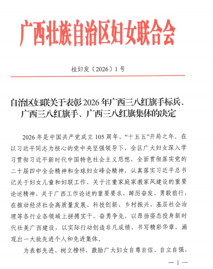 近日,自治区妇联发布关于表彰2026年广西三八红旗手标兵、广西三八红旗手、广西三八红旗集体的决定。我院冯智明同志荣获2026年广西三八红旗手荣誉称号。