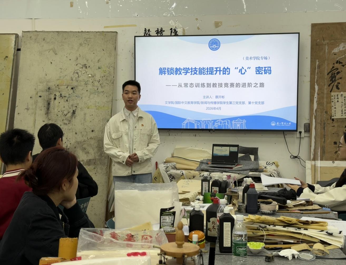 活动中,学生党员蔡开彬从“竞赛简介、教技准备、储能成长”三个维度展开分享,系统介绍了“田家炳杯”全国赛、全区师范生教学技能大赛等各级赛事,明确一、二、三类赛事的考核重点与参赛逻辑,以“初心:我想试试”激发学子参赛信心。针对美术学科特色,他秉持“细心:有的放矢”原则,结合区赛、校赛评分细则,分析教学设计、课件制作、模拟上课等核心模块,并以“初心:我想试试”的理念激发同学们的参赛热情,筑牢专业成长自信。在储能成长方面,他以“慧心:深度求索”为引领,围绕教学内容创新、课件审美设计、模拟授课打磨等环节精准赋能,倡导科学规划学业,实现专业审美与教学能力双向提升。