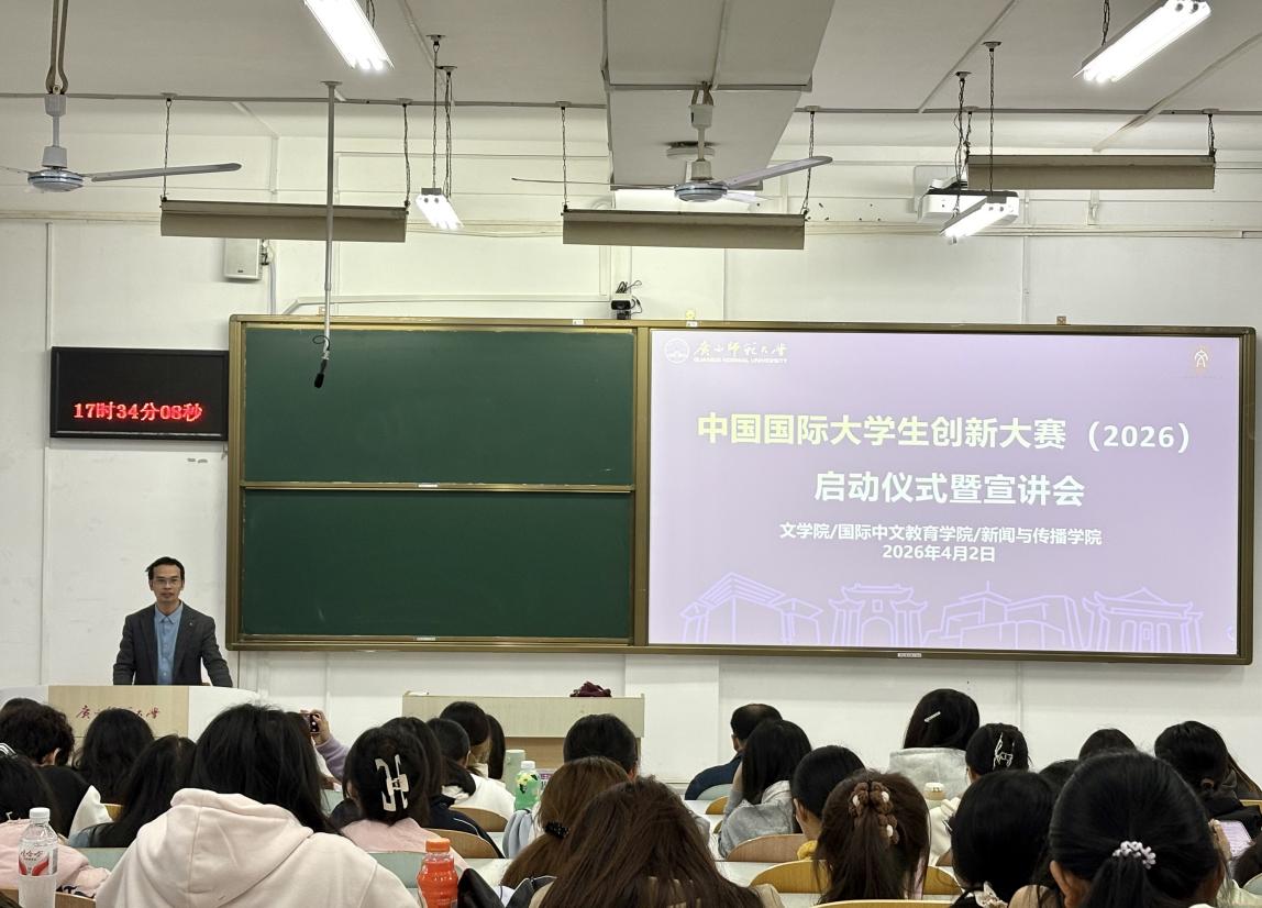 为深入落实学校创新创业教育工作部署,进一步激发学生创新精神与实践能力,引导广大学生积极参与高水平学科竞赛,2026年4月2日,文学院/国际中文教育学院/新闻与传播学院在文四303教室举办中国国际大学生创新大赛(2026)启动仪式暨宣讲会。学院副院长蓝善康,教师汤恺杰、高薇,往届大赛优秀获奖学生代表出席活动,学院2024级、2025级本科生参加本次活动。