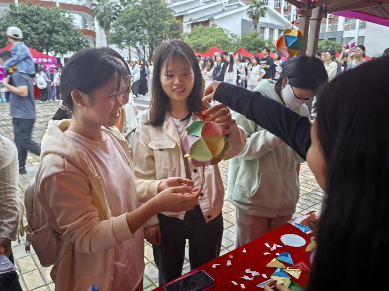 在实践体验环节,学院民间文学与民族文化教研室将课堂搬到容园社区户外,精心打造“民族文化体验营”。投壶、抛绣球、对山歌、画彩蛋、解谜语、猜春令等特色项目吸引了大量师生参与。学生们在趣味闯关中收集印章,兑换民族特色礼品,在亲身体验中触摸传统文化脉络。学院剪纸协会、望道读写社等学生社团也各展风采,分别推出“上巳剪彩,市集拾趣”剪纸活动与“寻春歌三月,踏声活非遗”读写活动,学子们穿针引线,将对“美美与共”的理解缝入十二瓣绣球的褶皱之中。