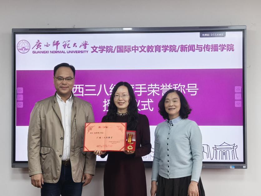 仪式上,校工会常务副主席刘月娥宣读了自治区妇联关于表彰2026年广西三八红旗手标兵、广西三八红旗手、广西三八红旗集体的决定,并代表学校为冯智明同志授予证书和纪念牌。