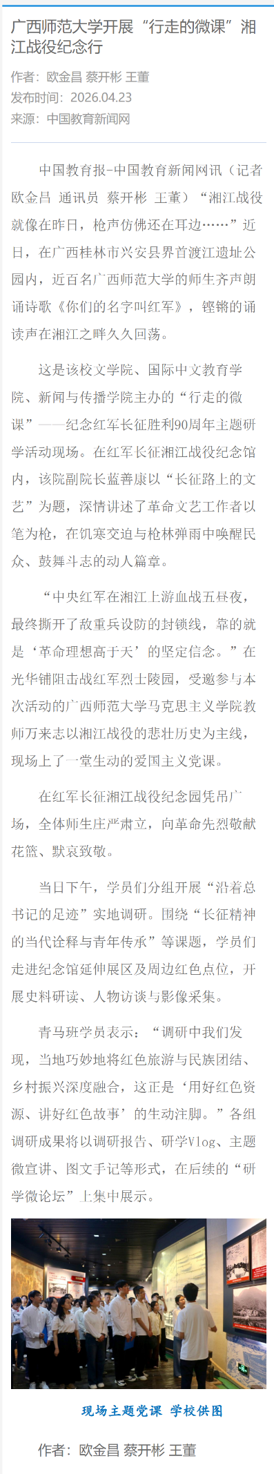 这是该校文学院、国际中文教育学院、新闻与传播学院主办的“行走的微课”——纪念红军长征胜利90周年主题研学活动现场。在红军长征湘江战役纪念馆内,该院副院长蓝善康以“长征路上的文艺”为题,深情讲述了革命文艺工作者以笔为枪,在饥寒交迫与枪林弹雨中唤醒民众、鼓舞斗志的动人篇章。