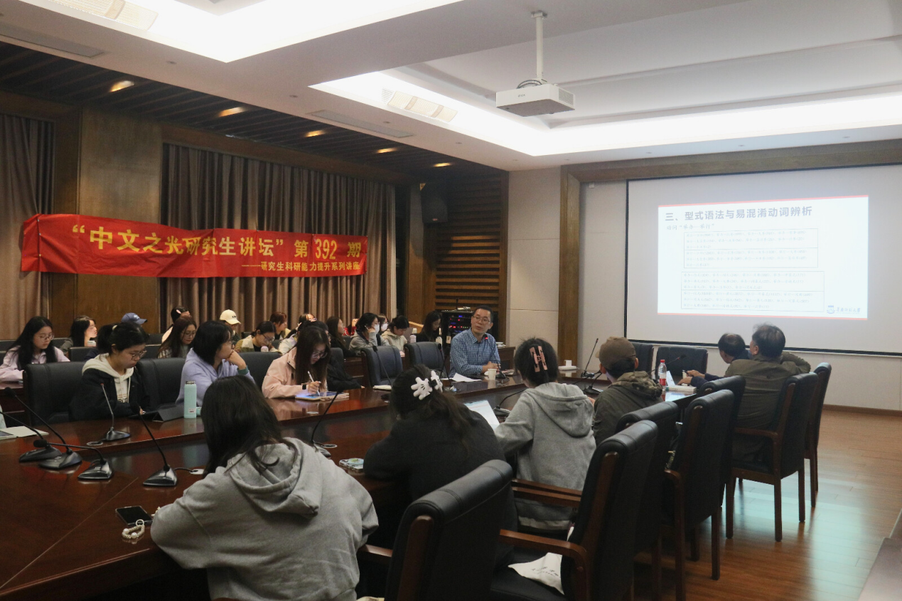 10月22日晚,我院在雁山校区行政北楼第四会议室举行第392期“中文之光・研究生学术讲坛——研究生科研能力提升系列讲座”。本期讲座特邀华南师范大学方清明教授主讲,由我院陈景元教授主持,教师代表樊中元教授、赵鹏程副教授和汉语言文字学、语言学及应用语言学、国际中文教育等专业研究生参加了此次讲座。