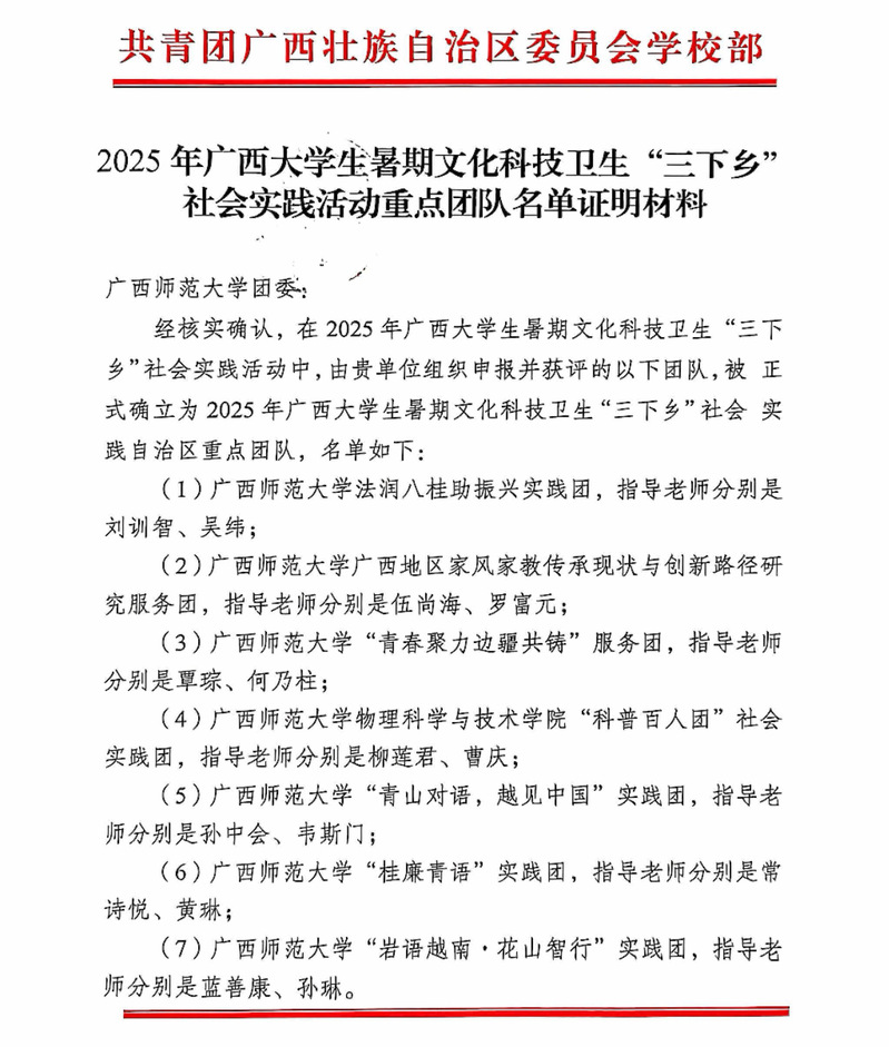 近日,2025年广西大学生暑期文化科技卫生“三下乡”社会实践活动自治区重点团队名单正式公布。经团队申报、校级推荐、区级评审等严格程序,我院“青山对语,越见中国”实践团与“岩语越南·花山智行”实践团凭借扎实的实践成效和鲜明的专业特色,从全区众多团队中脱颖而出,双双获评自治区重点团队。这是对我院长期以来坚持立德树人、深化实践育人的高度肯定,也是学院师生扎根基层、服务边疆的生动体现。