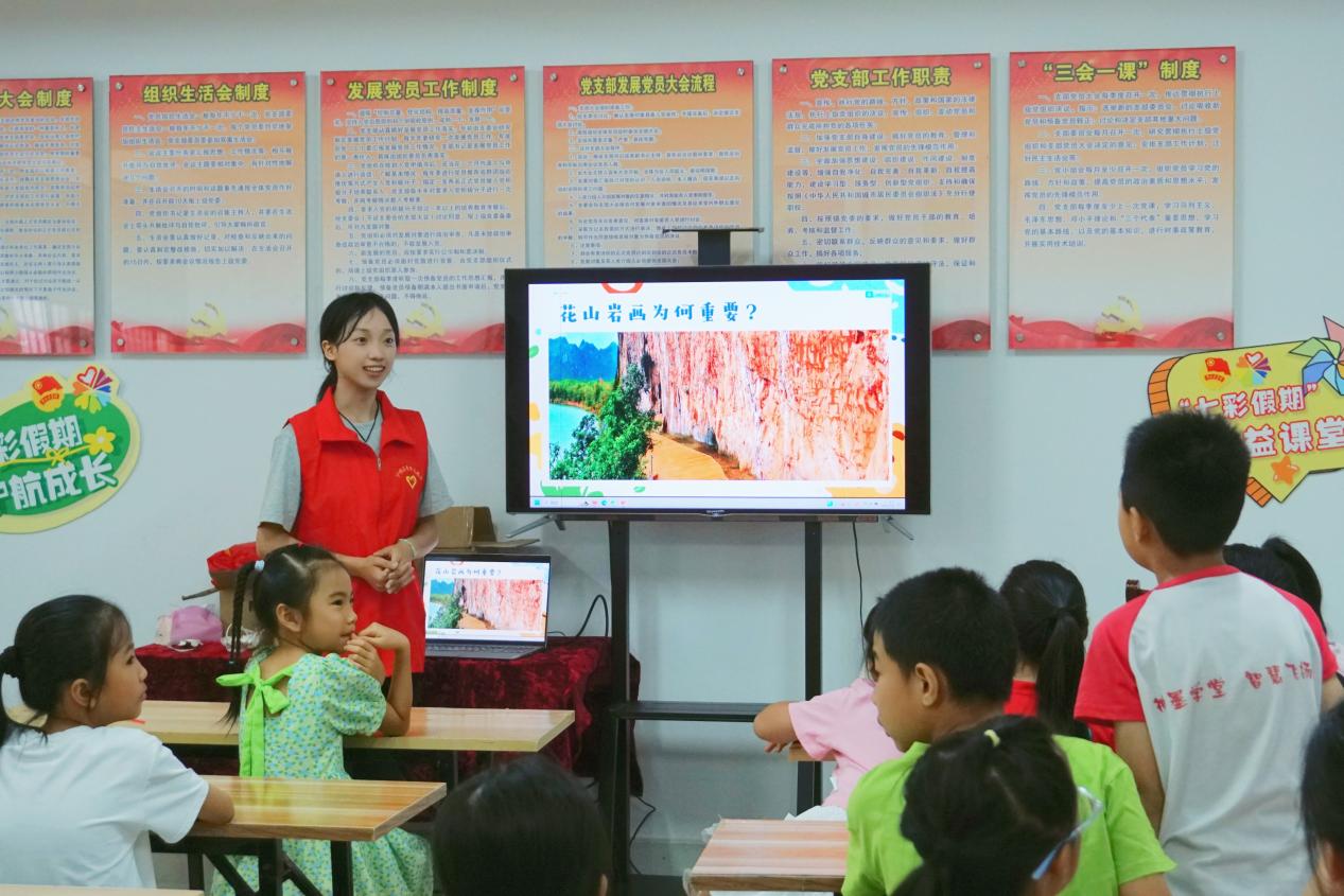 “岩语越南·花山智行”实践团队在崇左市宁明县为当地小学生介绍花山岩画
