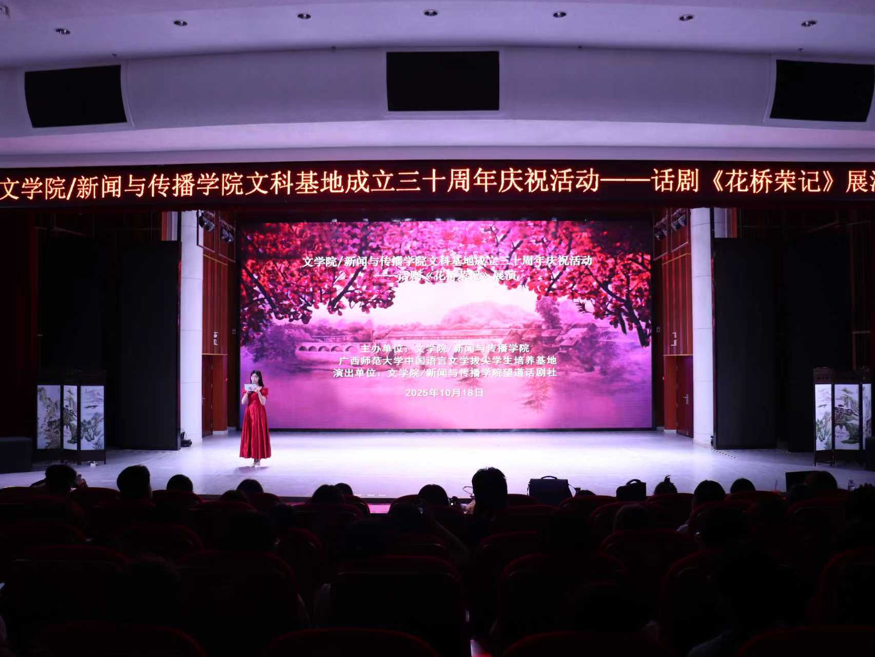 10月18日晚19时,文学院/新闻与传播学院文科基地成立三十周年系列庆祝活动之话剧《花桥荣记》展演,在雁山校区音乐学院三楼演艺厅隆重举行。活动现场座无虚席,吸引了来自各学院的众多师生前来观看,共同见证了这一融汇文学情怀与戏剧艺术的视听盛宴。