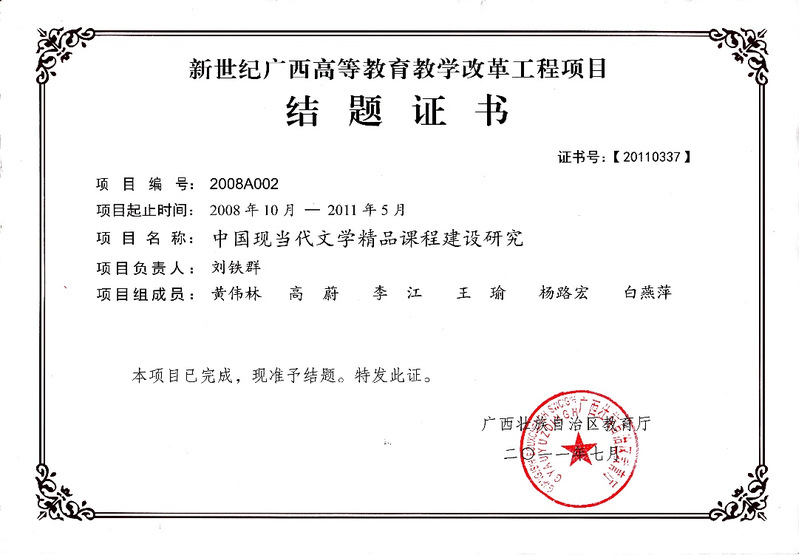 1.刘铁群主持:“中国现当代文学精品课程建设研究”,广西高等教育教学改革工程立项重点项目